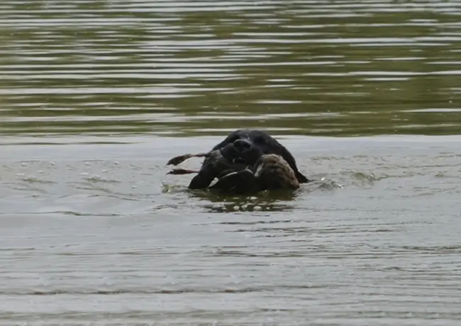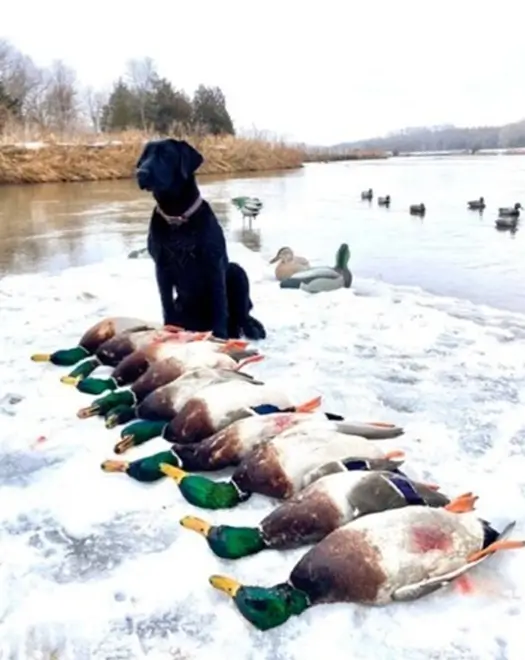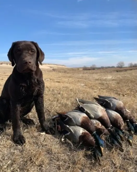 Jack, a young chocolate Lab with several ducks he retrieved.